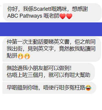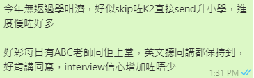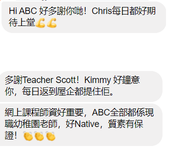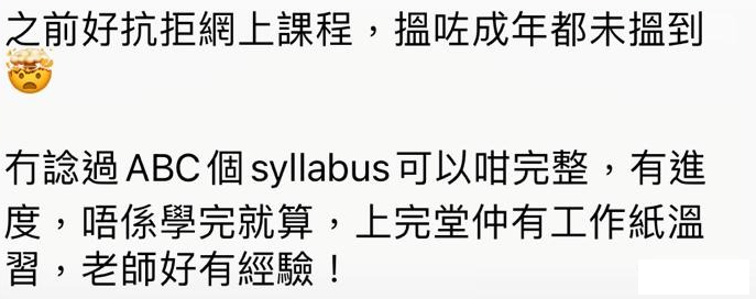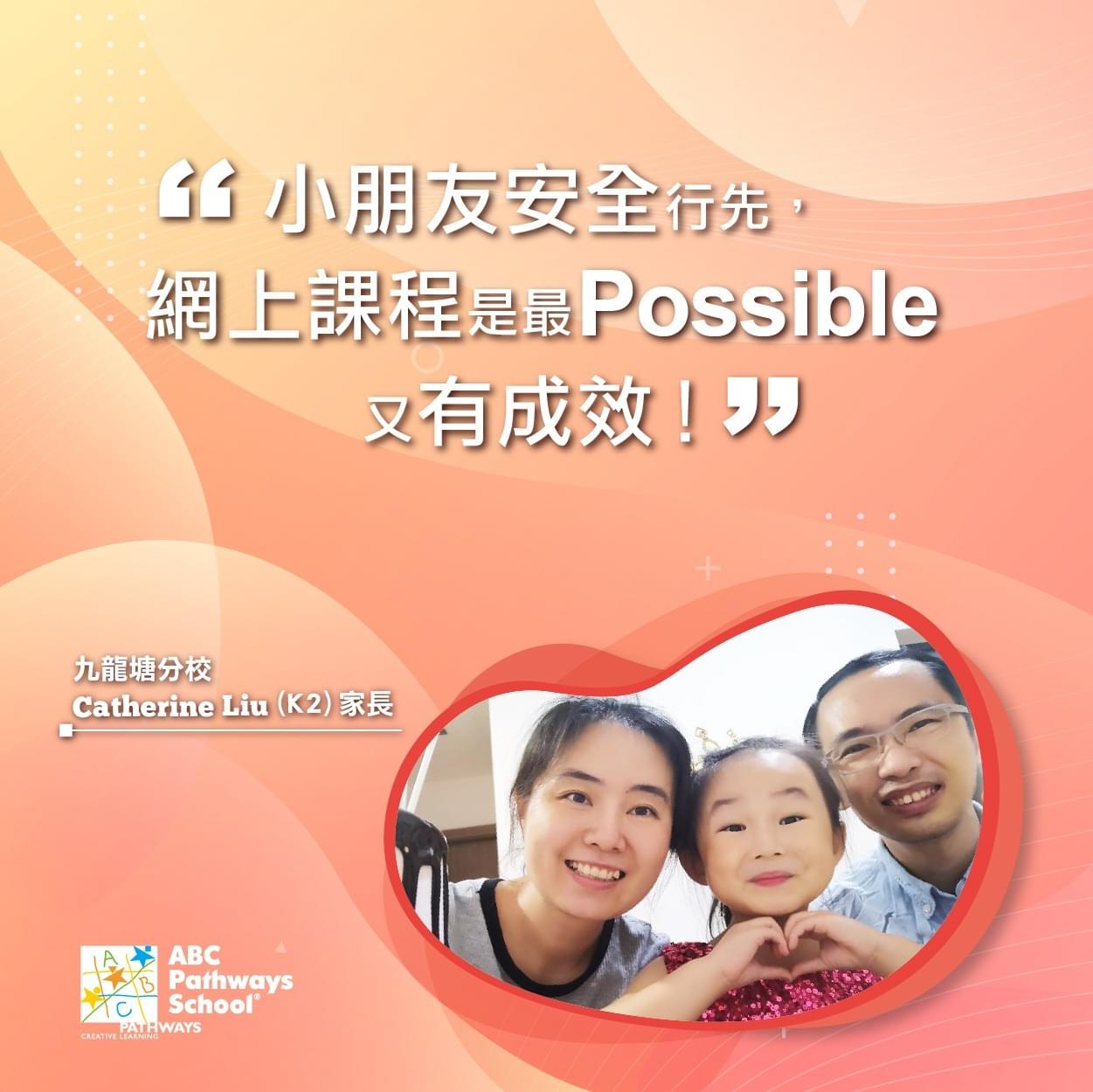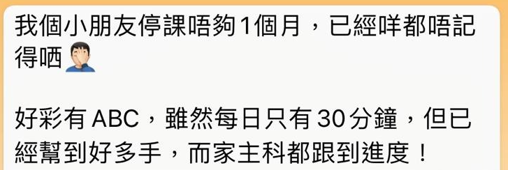 「小朋友安全行先,網上課程係最Possible,又有成效!網上學習,也許未達面授課堂同樣成效,然而我相信在這大環境中,大人和小朋友也需要嘗試調較和適應,換個模式去繼續吸收和學習。網課未必是「最好」,但「最能做到」。」
